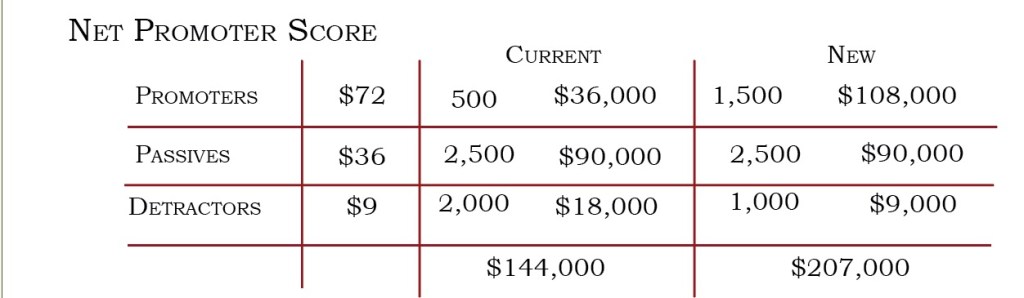 In order to see the benefit making our suggested changes would have on the Halloween Cruise we created a formula based off of the Net Promoter score. This formula shows how much the promoters, passives and detractors spend at the Halloween Cruise. By implementing our solution we expect a 300% increase in the promoter section coming from passives. We would also expect a 50% decrease in detractors from an increase in passives. This would lead to a 144% increase in revenue.
